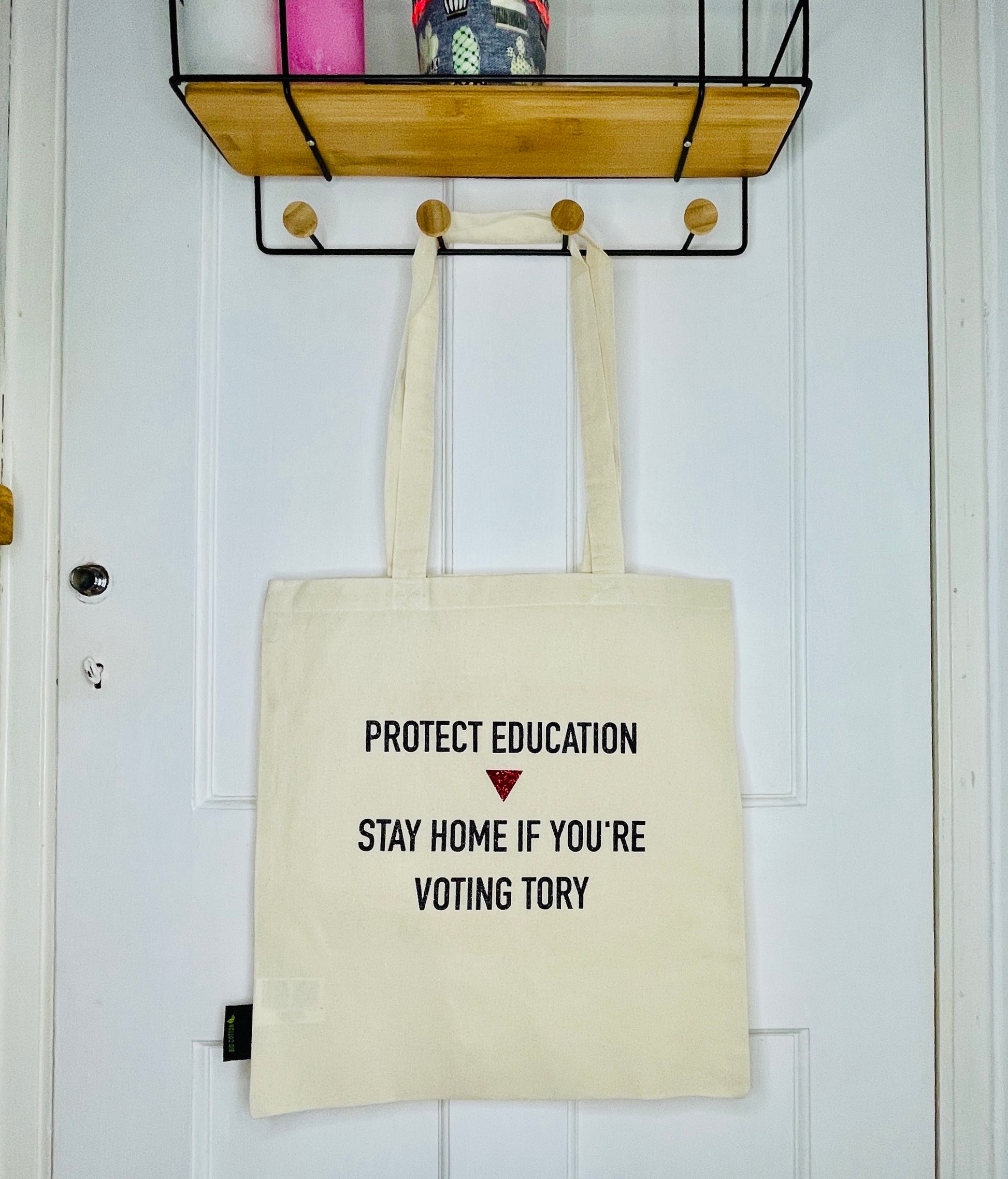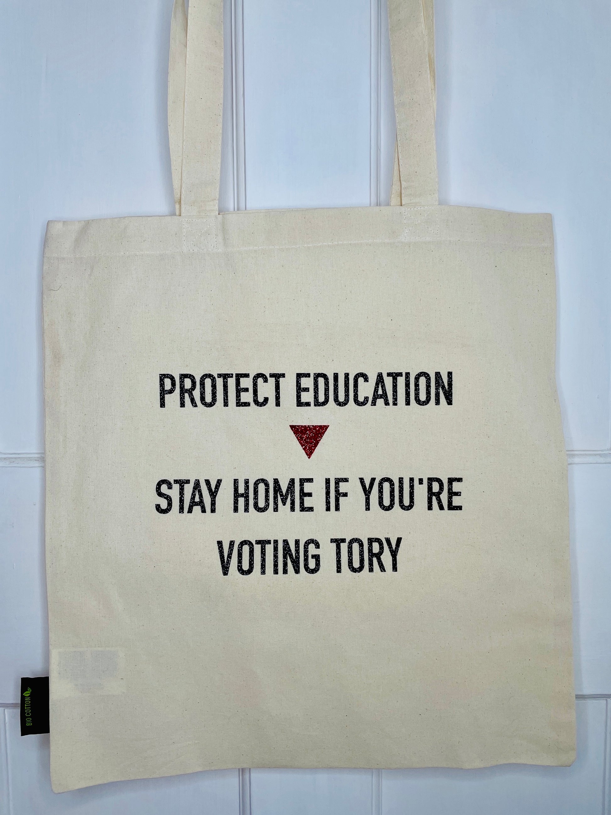 Stand up for education with this bold political organic tote bag. Made from 100% certified organic fair trade cotton. Its sturdy design makes it perfect for carrying groceries, books, or your picnic! The handles are long enough to wear over your shoulder for effortless carrying.
