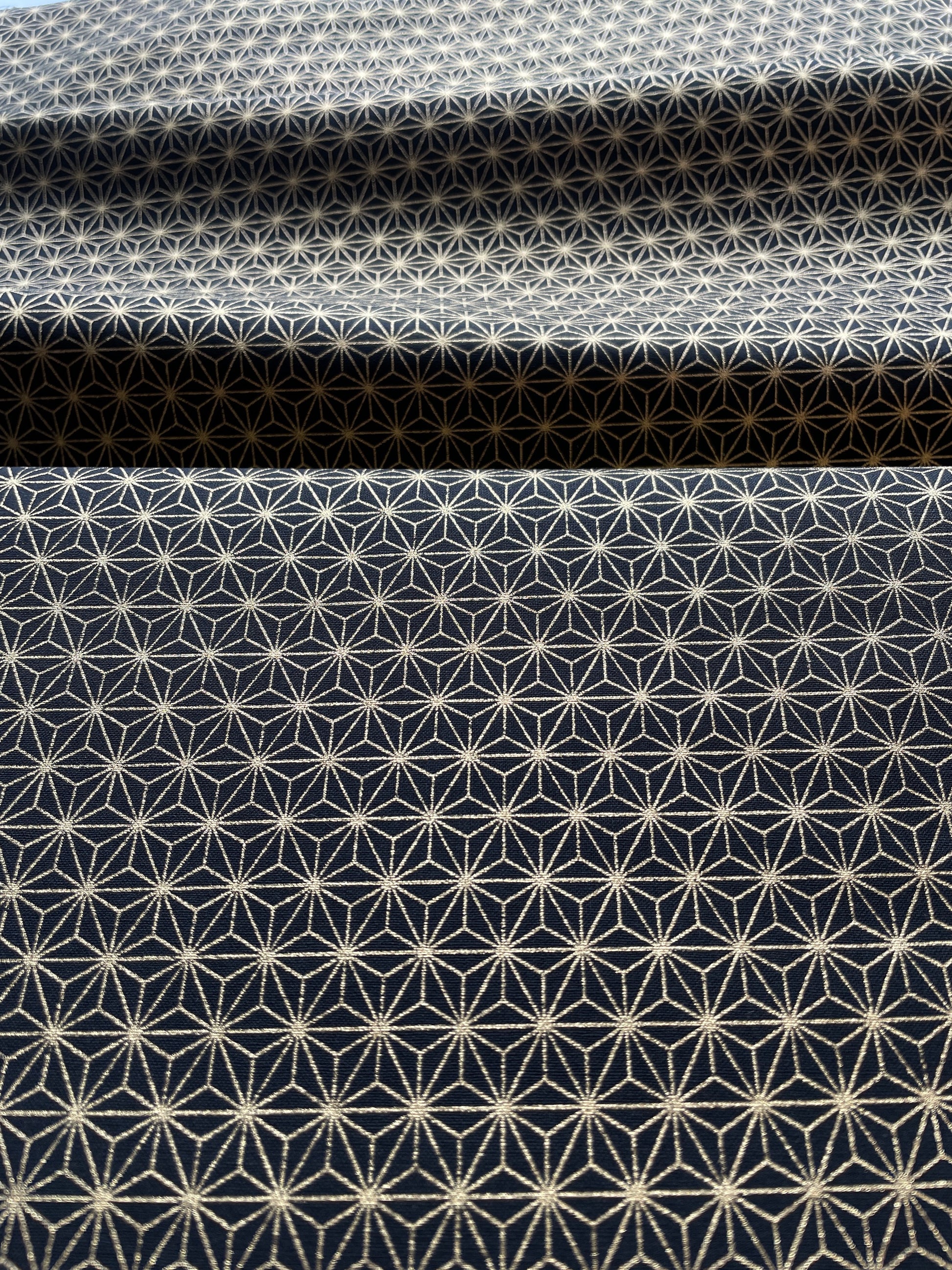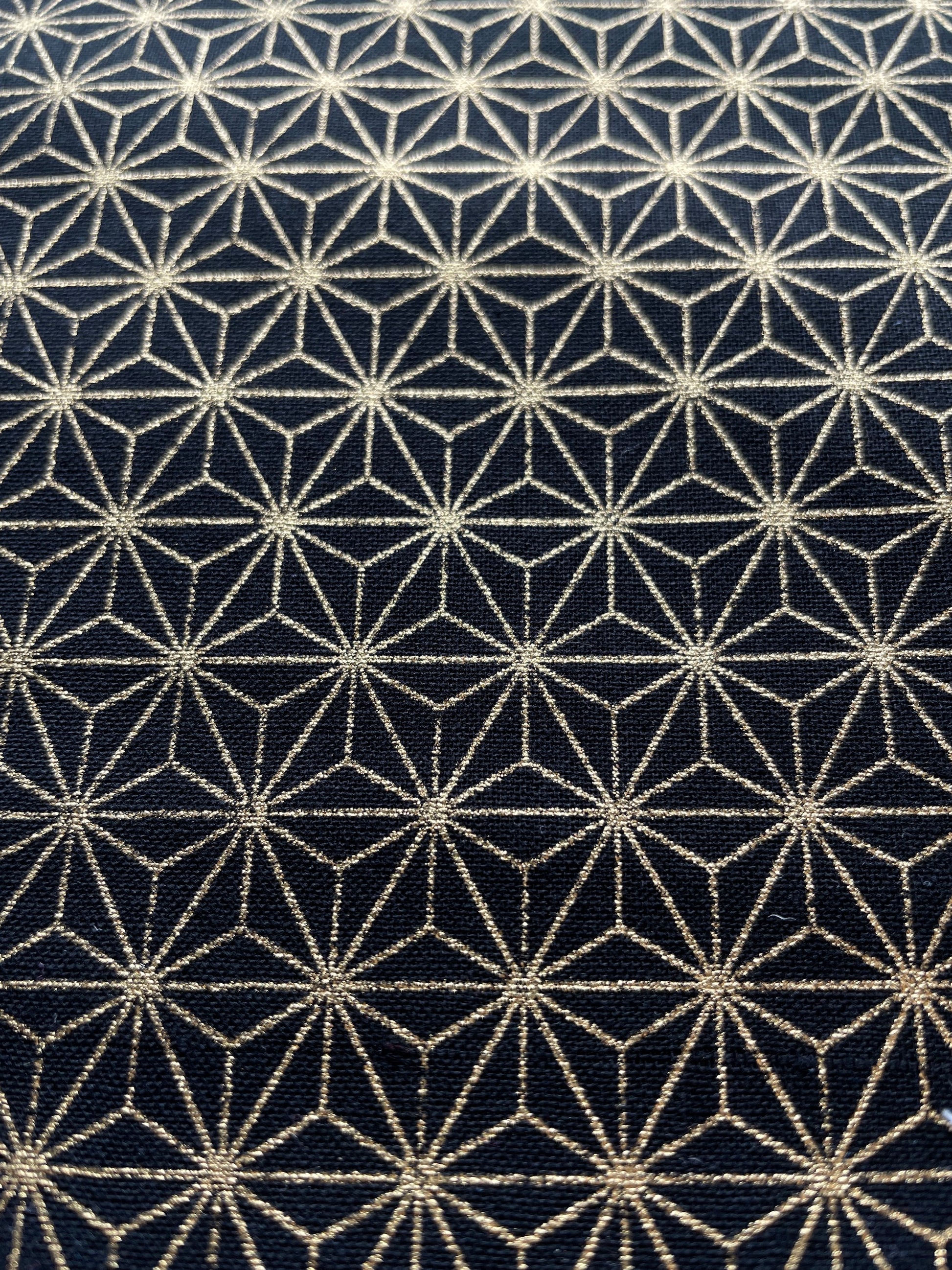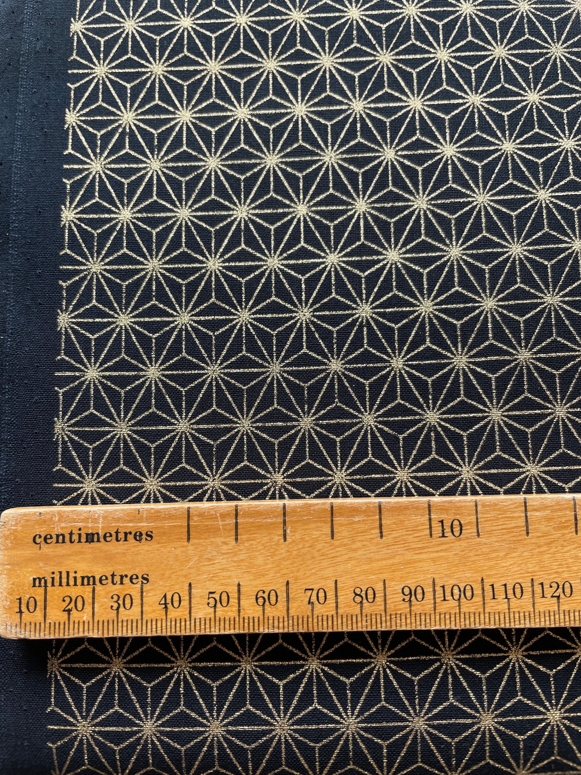 Make a statement with this luxurious fabric that shimmers and shines with every movement. It's 100% cotton making it easy to sew, and suitable for beginners. The fabric is called Yakata and features metallic gold 3D geometric stars on a black background.