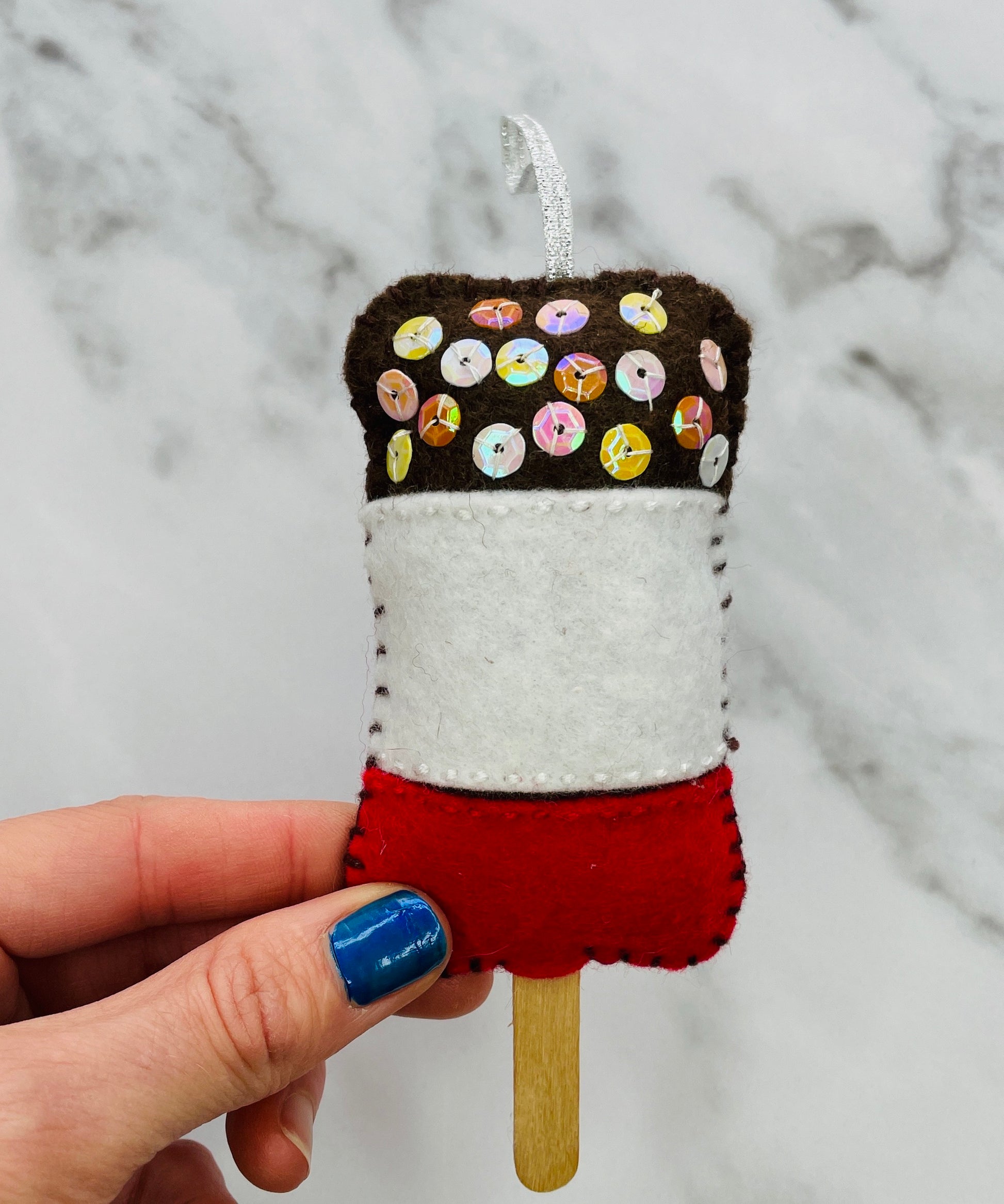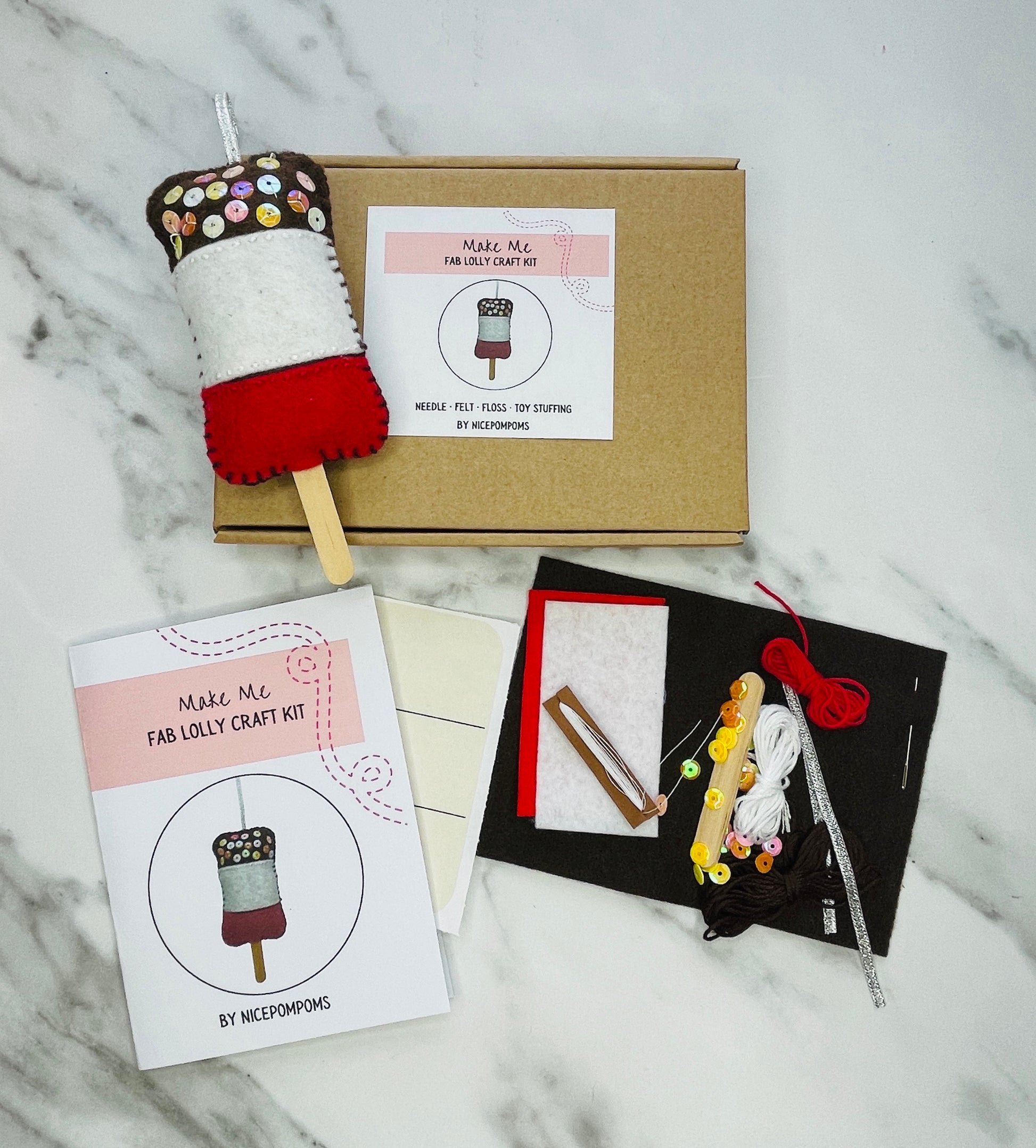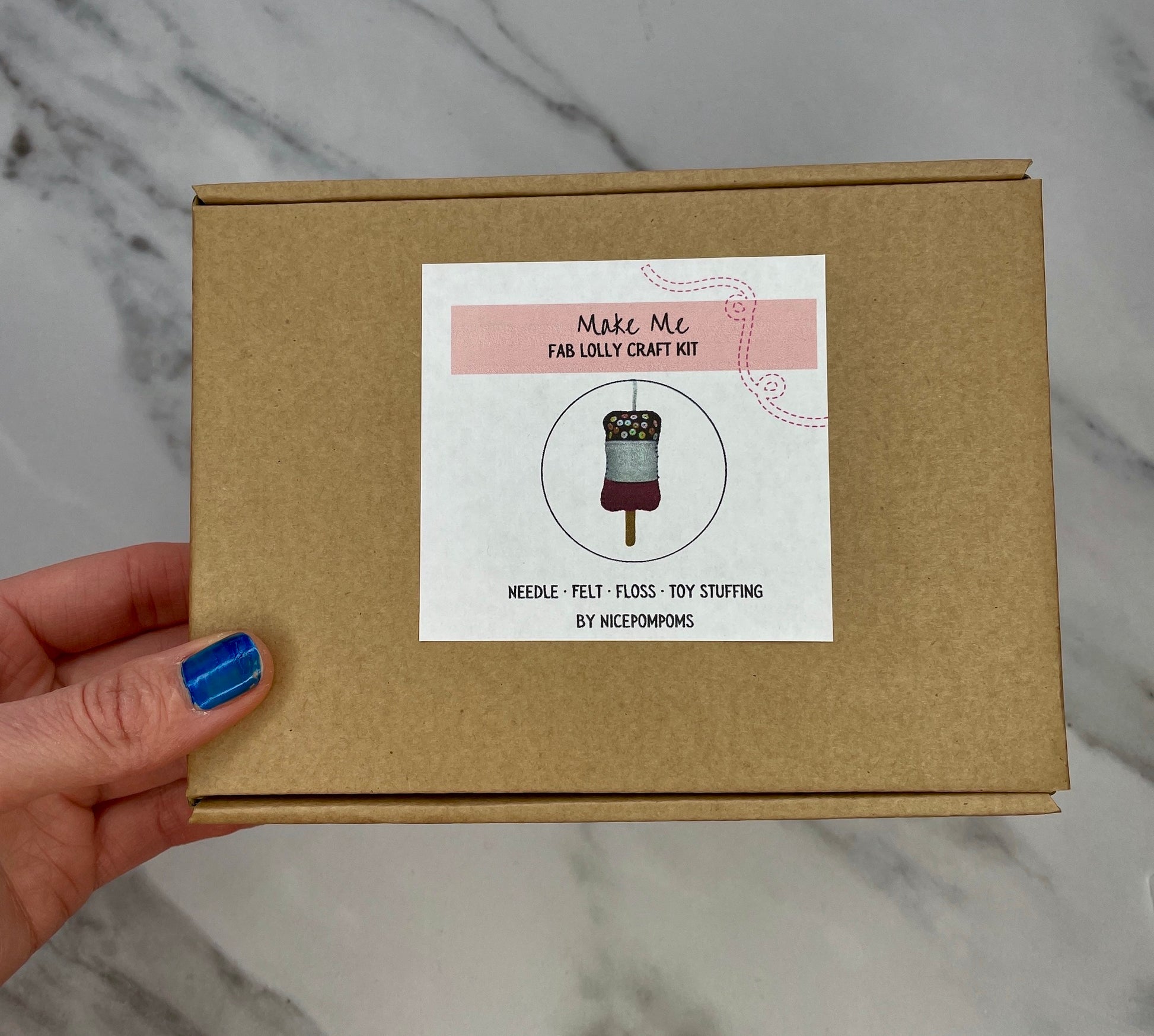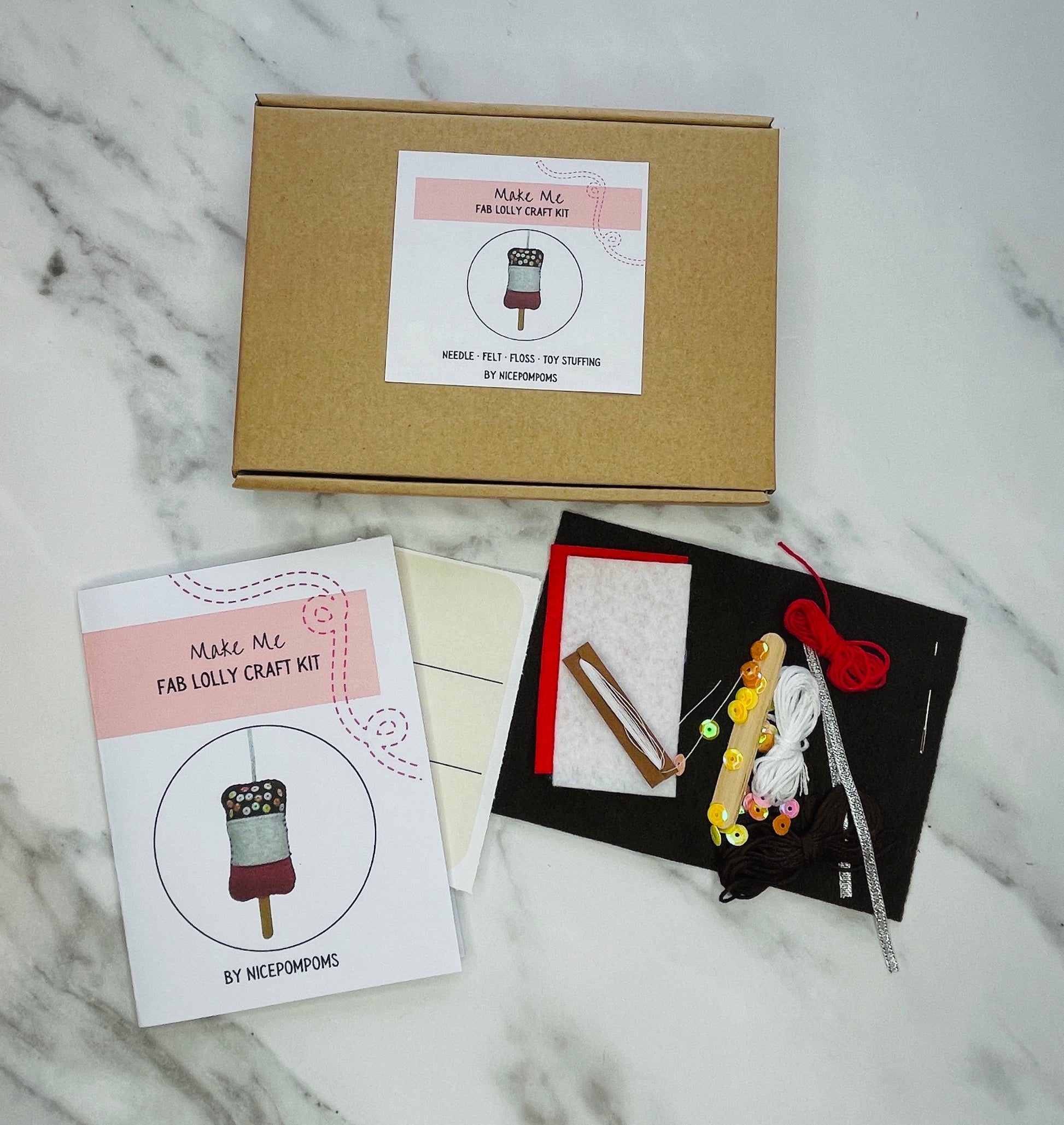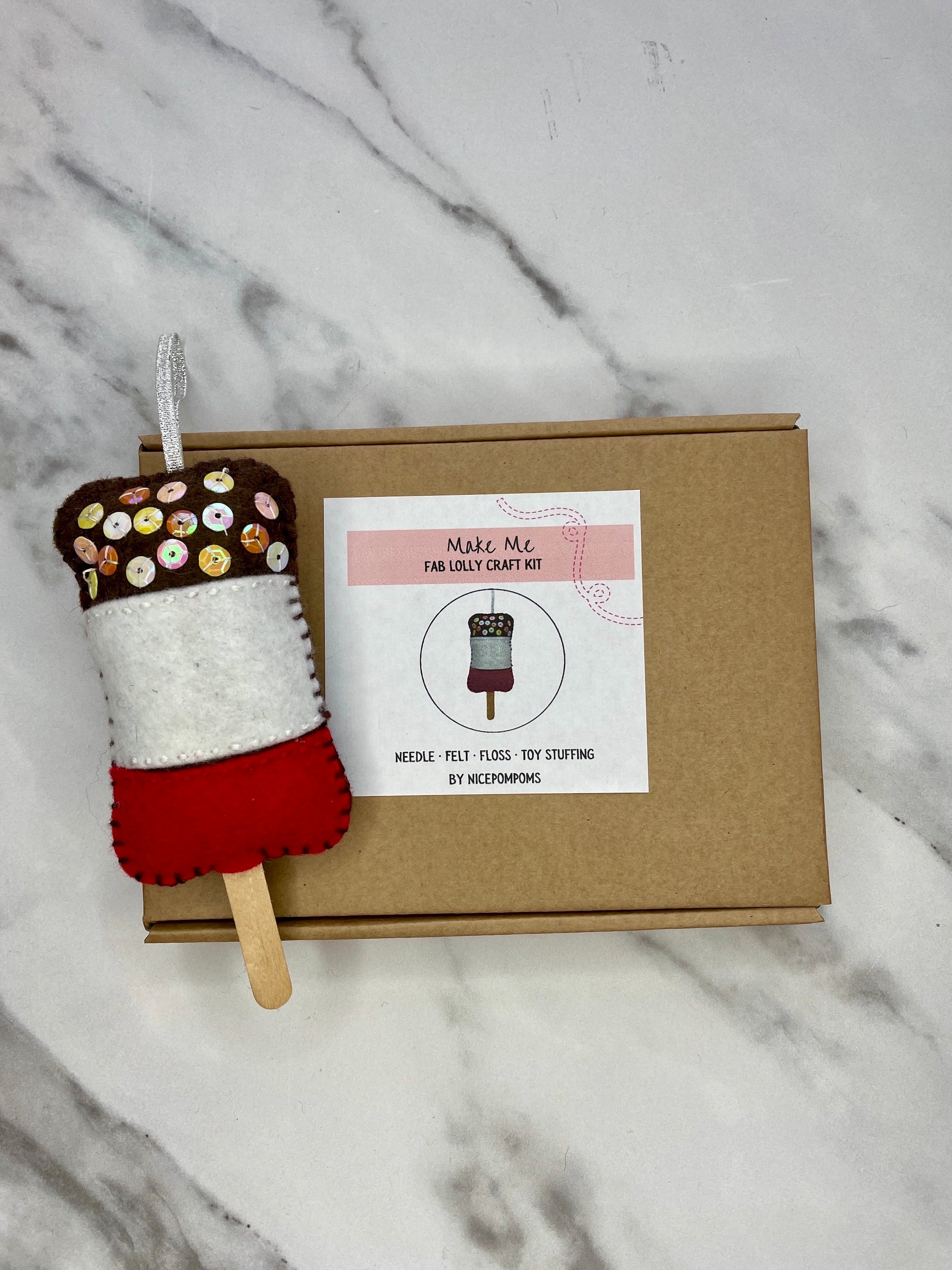 This kit includes everything you need to make yourself a little fab ice lolly hanging ornament and comes to you in my brand new packaging! The only thing you need is a pair of scissors and a little bit of time. In the kit you'll find a detailed instruction booklet, paper templates, acrylic felt, embroidery floss, mini pompoms, buttons and sequins (depending on the ornament), toy stuffing and a needle.