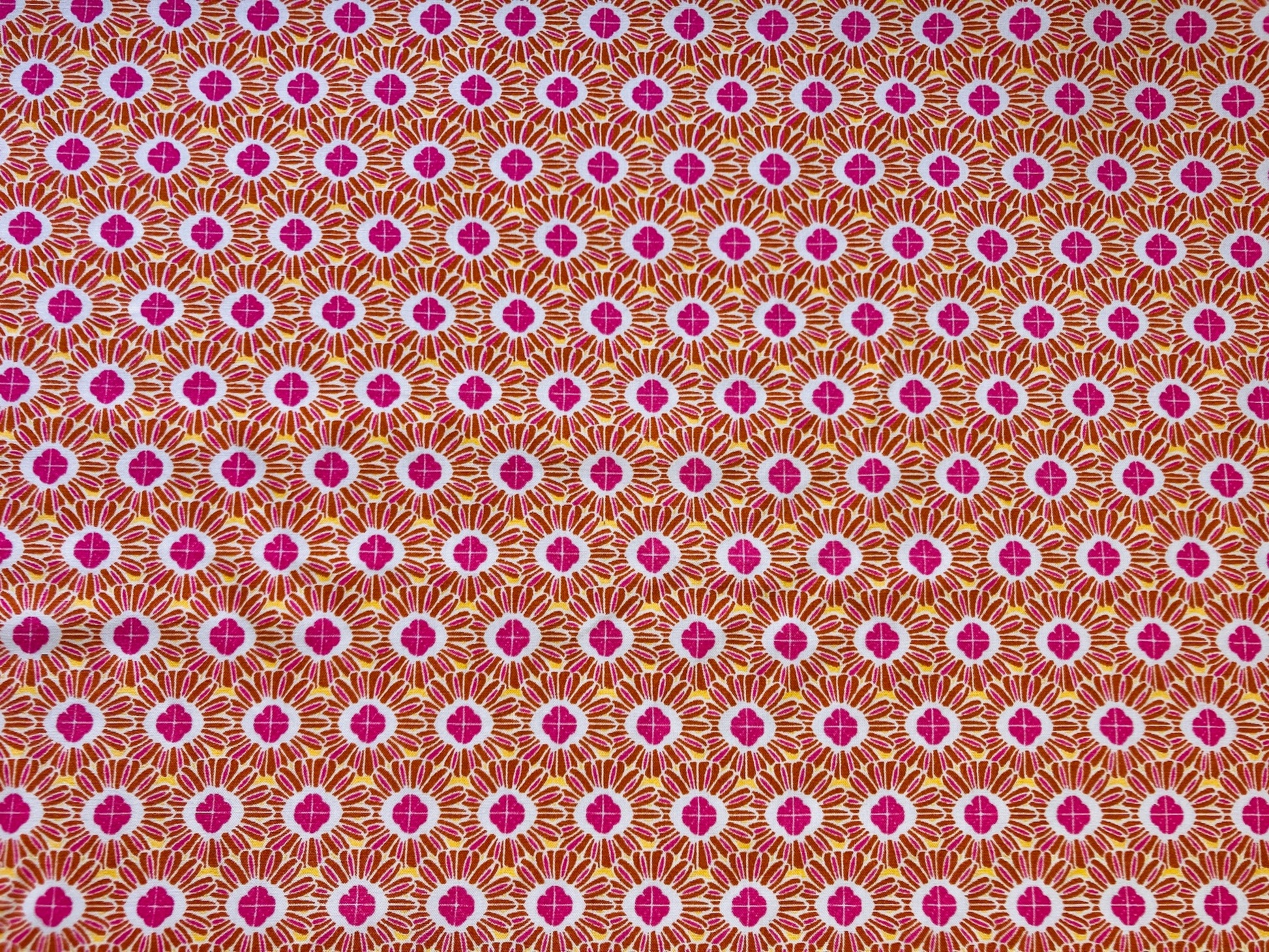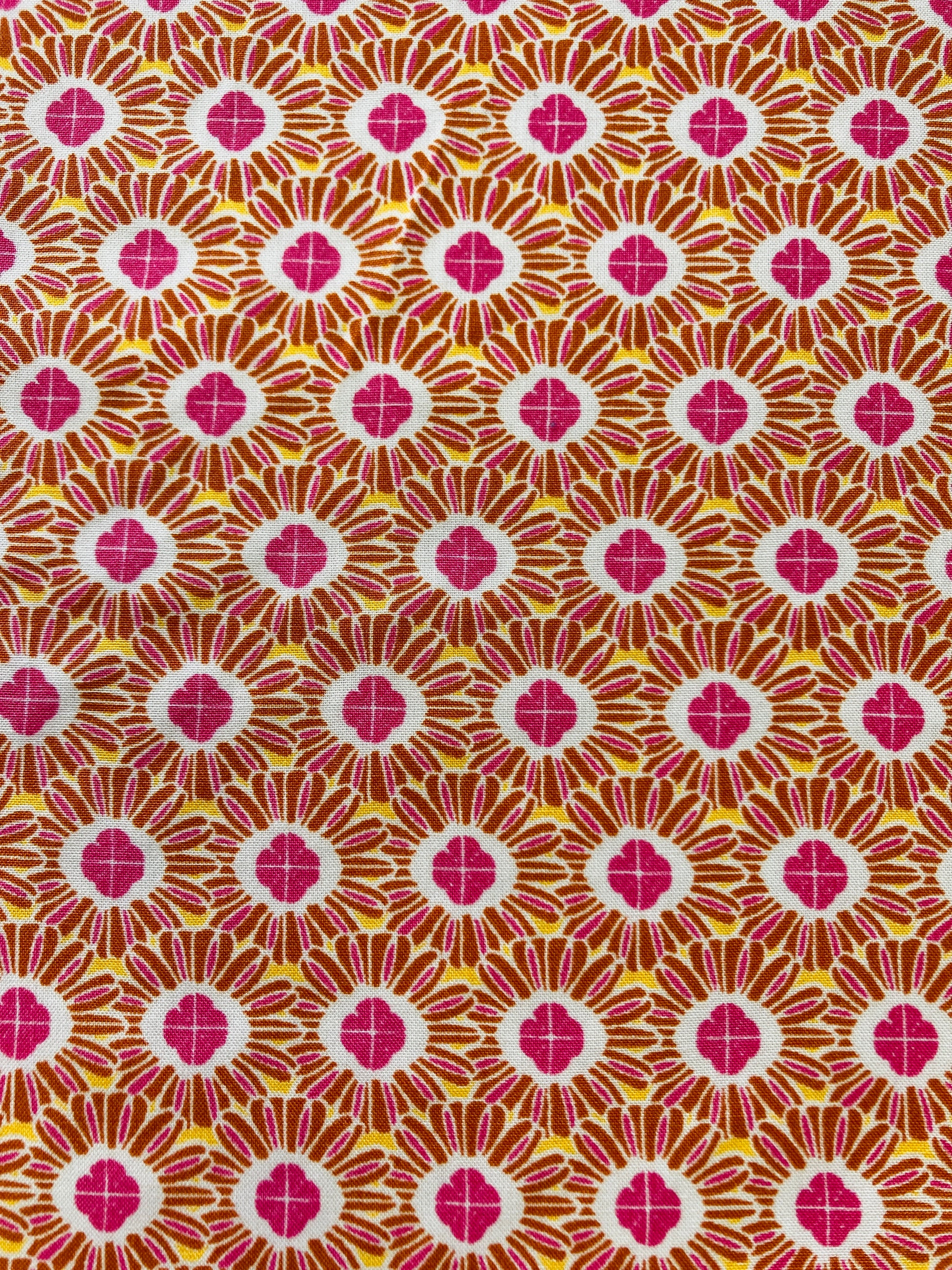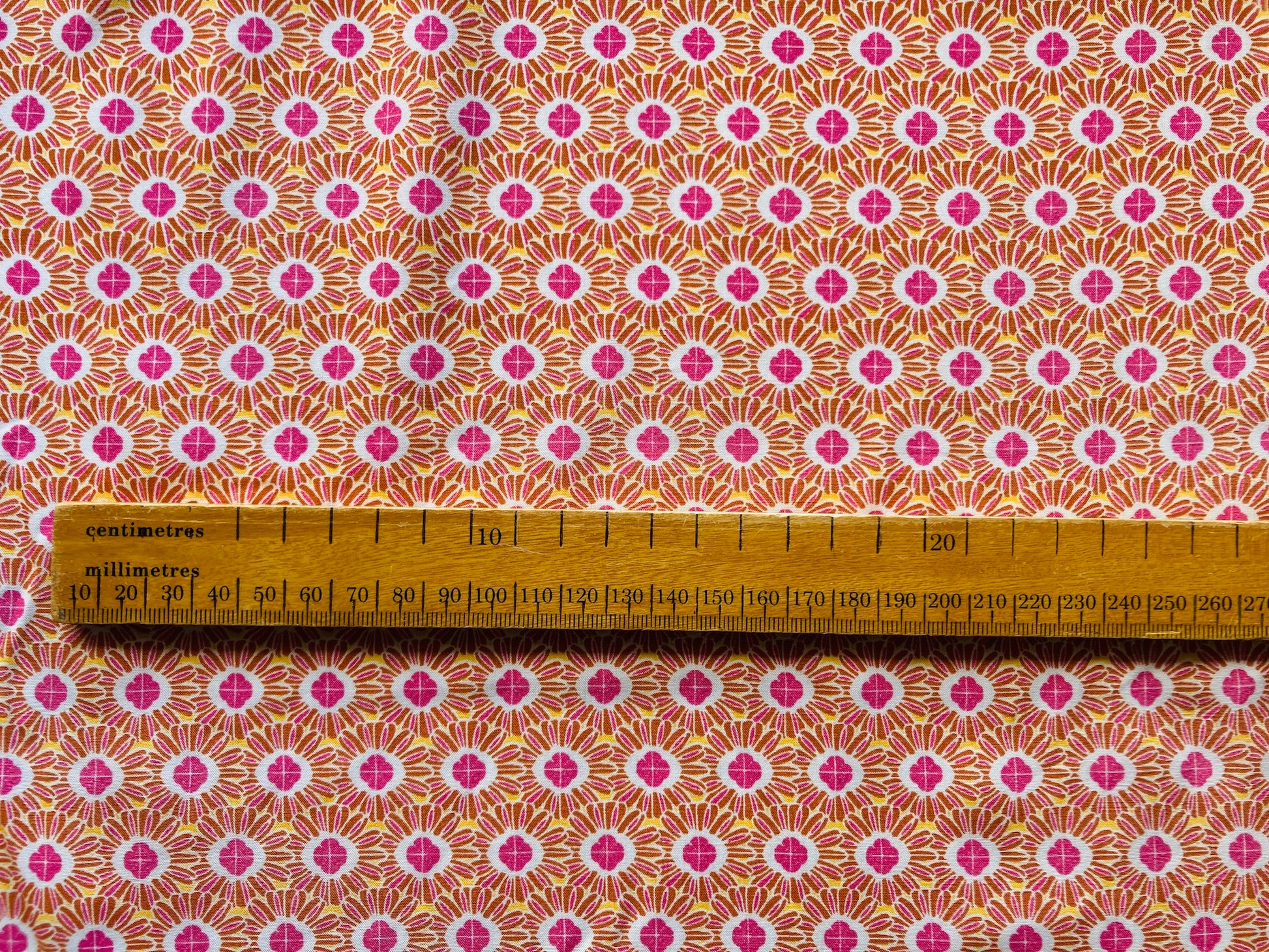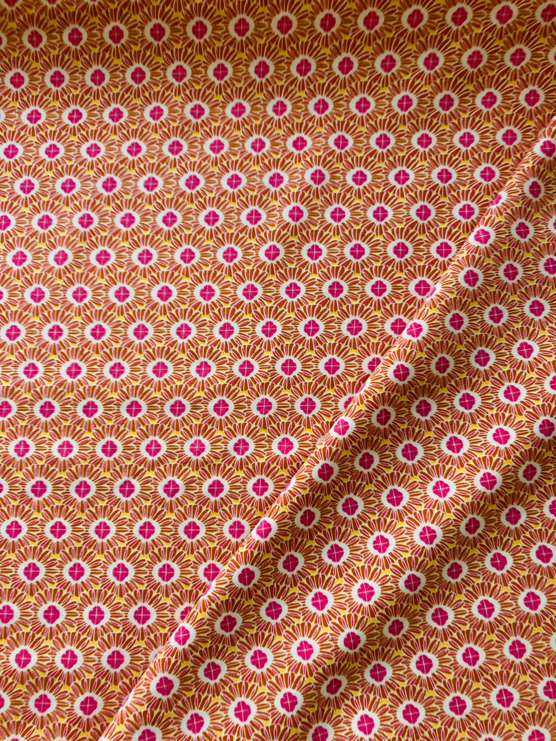 Bring a burst of sunshine to your next project with this delightful orange and pink daisy rayon fabric from Mistral!