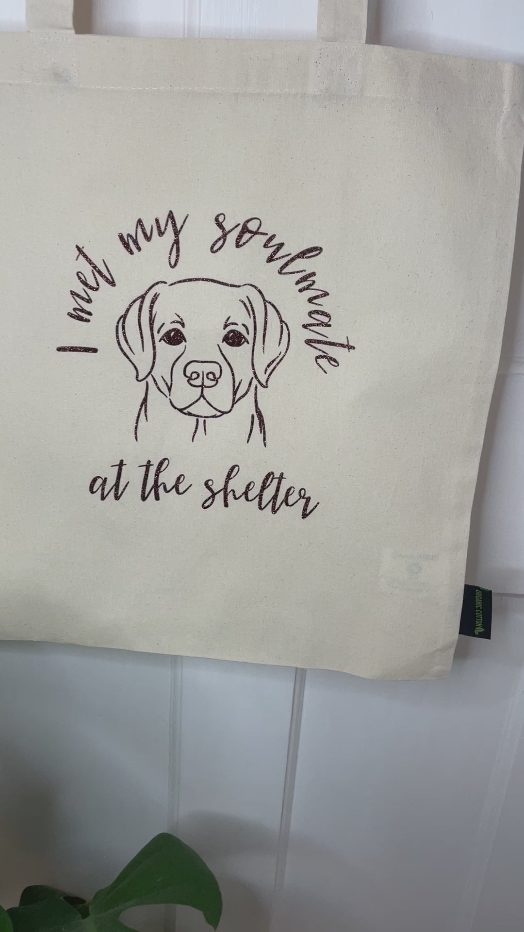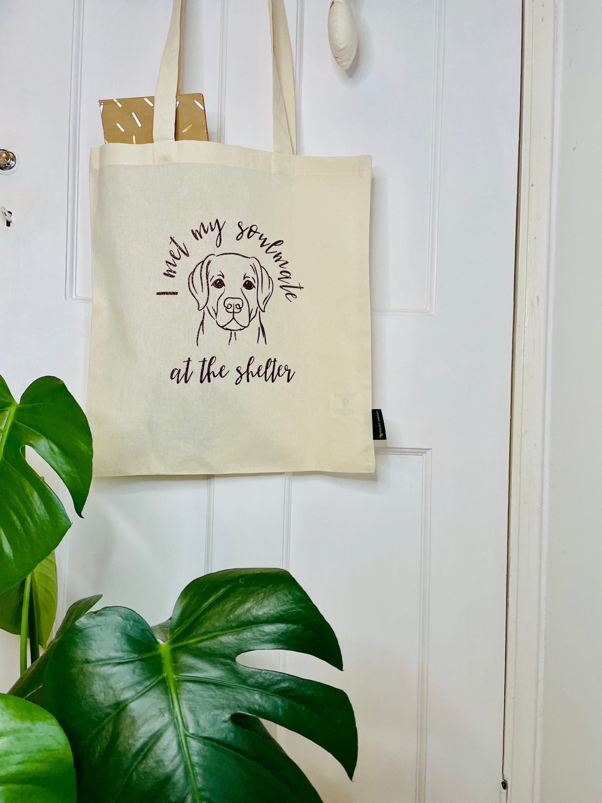 Each bag is made from 100% certified organic fair trade cotton and features a glittery vinyl silhouette of a Labrador, along with the statement 'I met my soulmate at the shelter'. Choose from a range of colours: black, brown, purple, and neon pink.