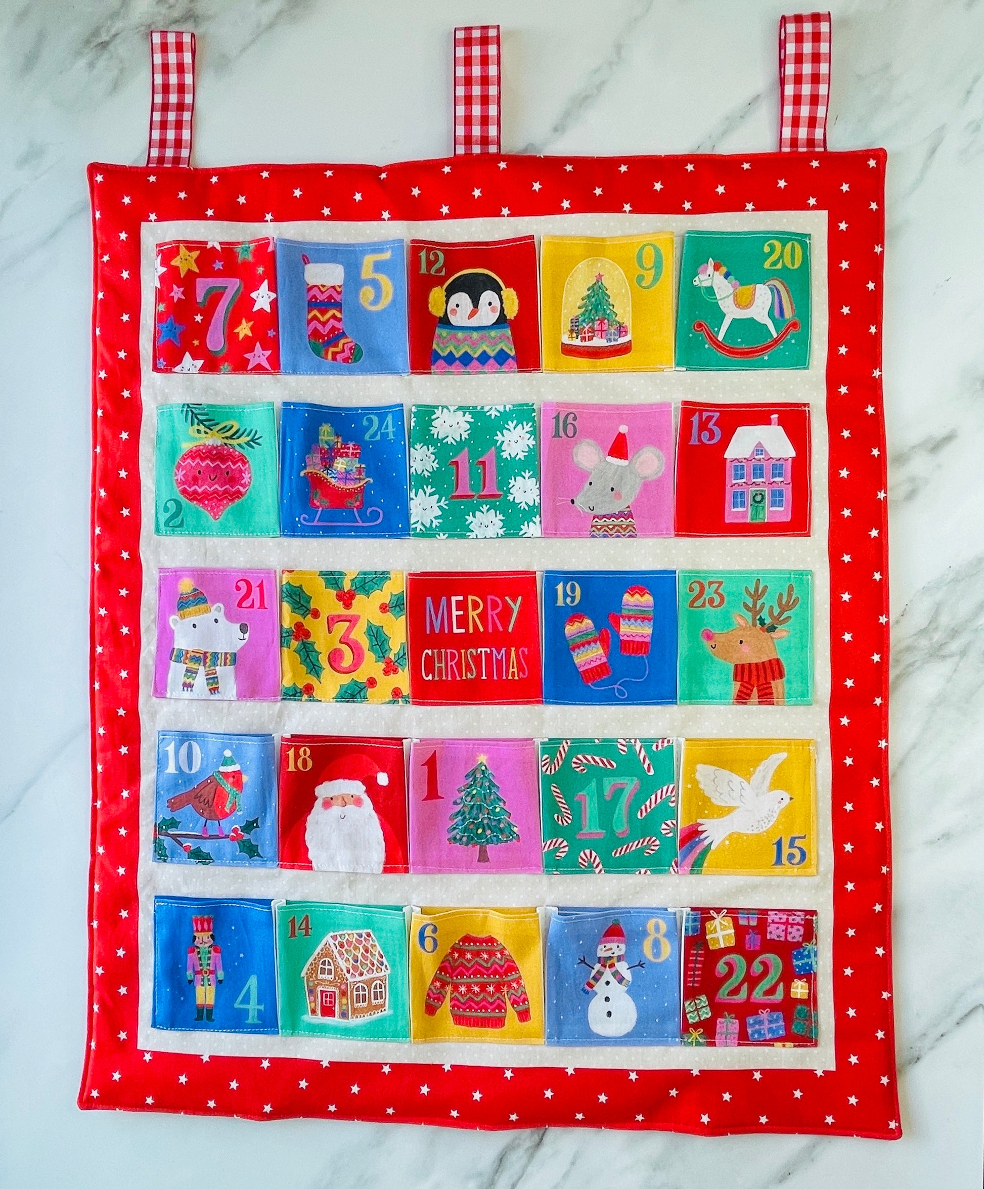 This adorable design has 25 numbered pockets, each with a festive theme e.g. a gingerbread house, a penguin and many more. There is plenty of room for treats and could even accommodate treats for two if you wanted to share! I have used a thin 2 ounce wadding to make the advent a sturdier. The back is quilted with vertical lines and I have used a red and white starry cotton fabric. It's top stitched around the top to prevent rolling. The hanging loops are made from gingham ribbon.