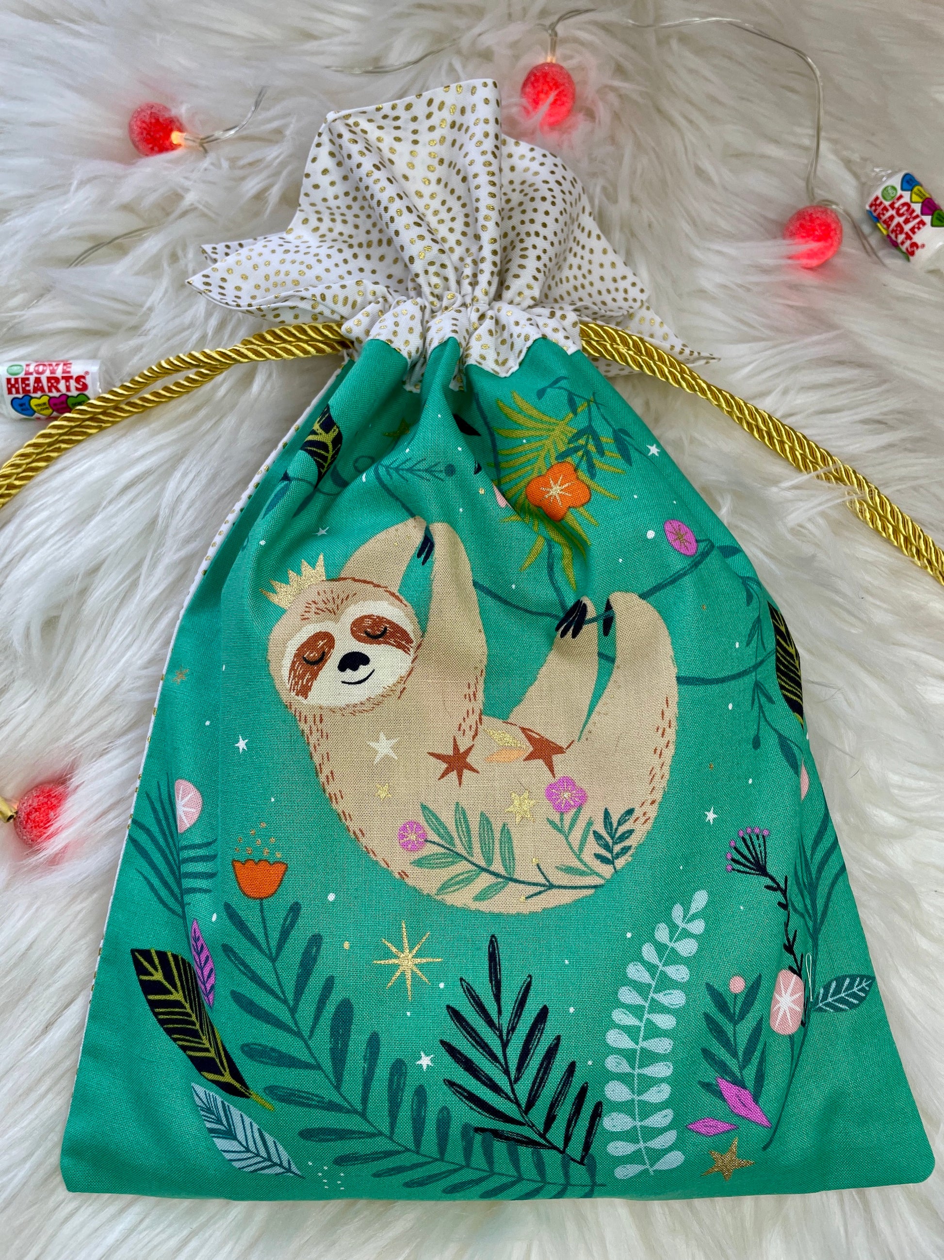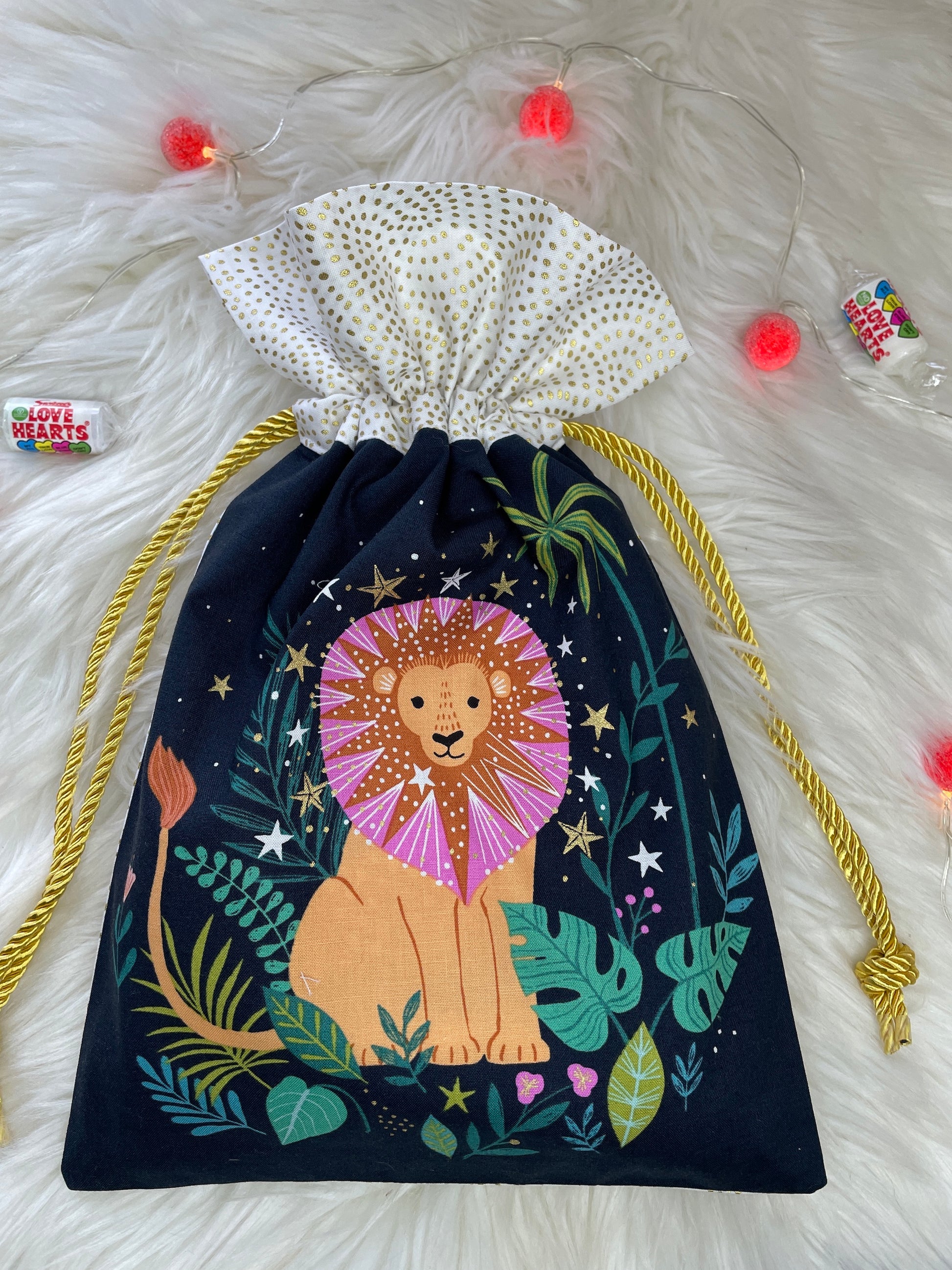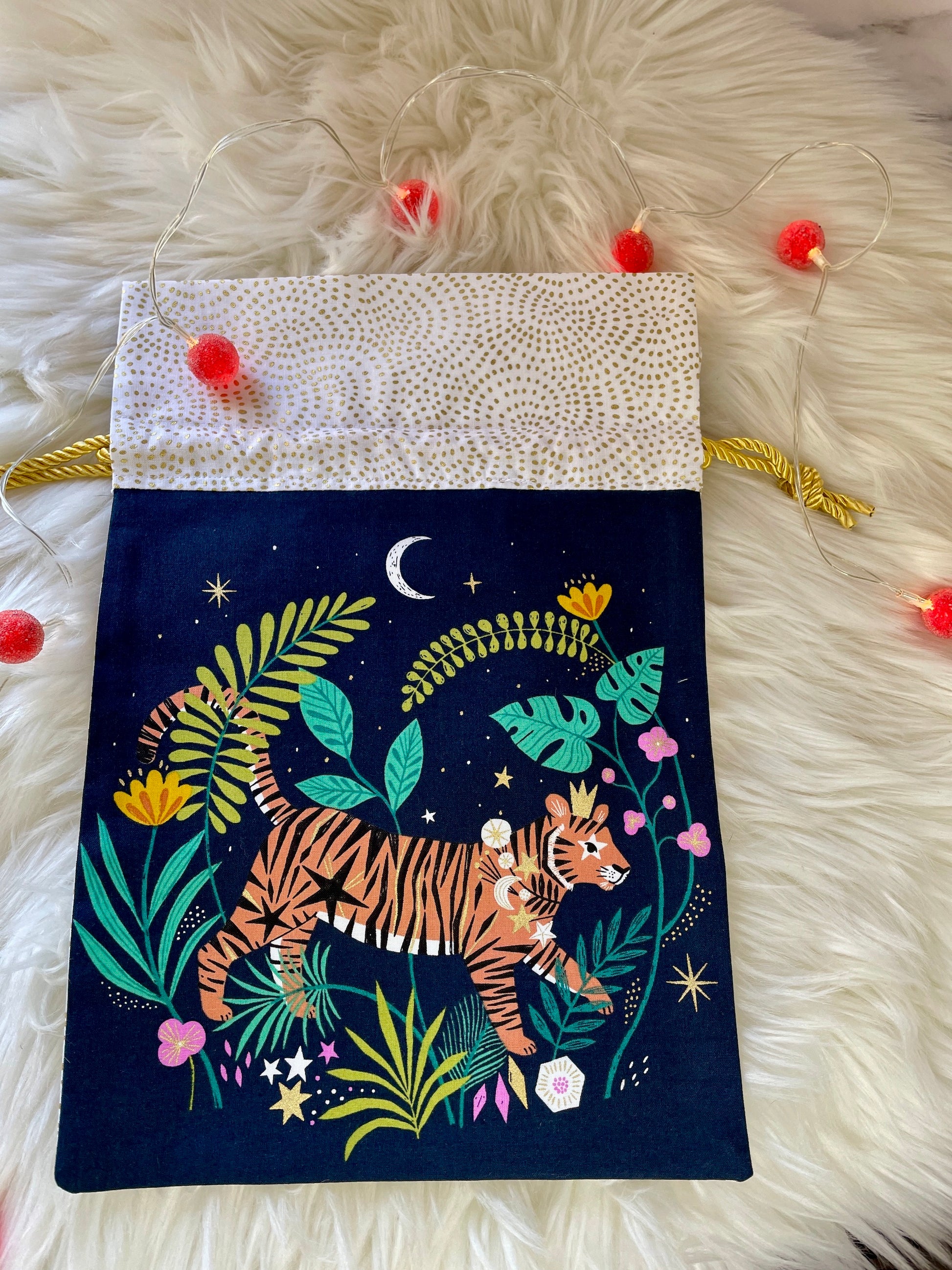 Made from 100% designer cotton fabric, the front features a cute animal surrounded by brightly coloured flowers and leaves, with flashes of metallic gold, on either a dark blue, turquoise or green background. The top drawstring channel and backing fabric is a gorgeous white cotton which has gold metallic swirls on. The bag is closed with a gold braided cord.
