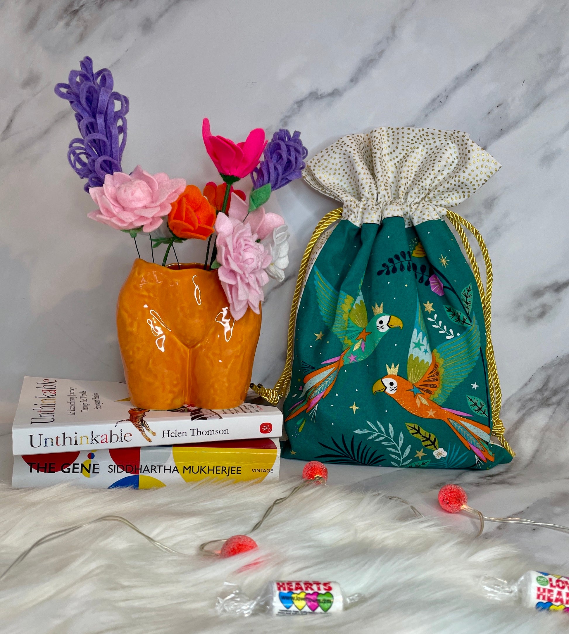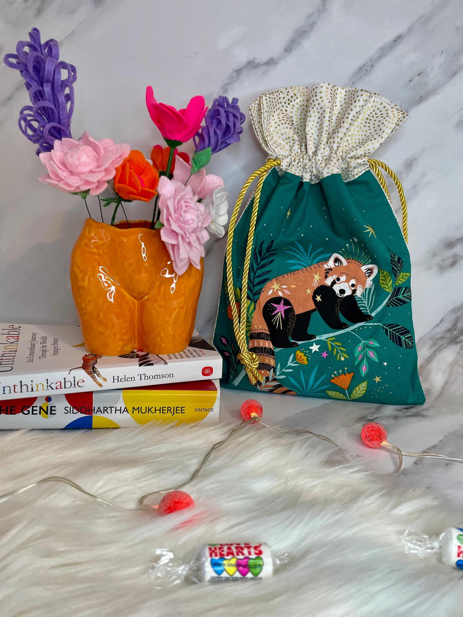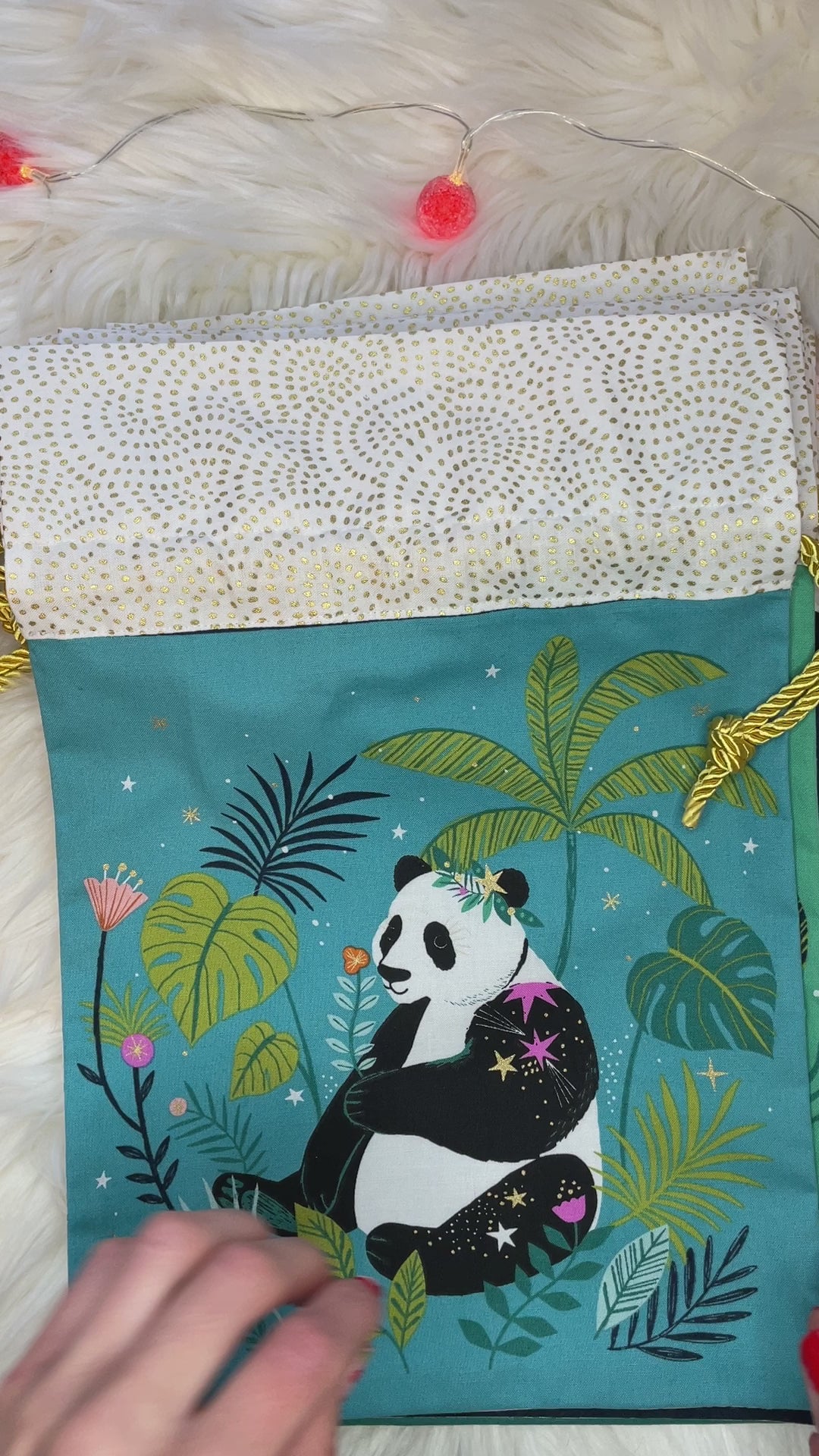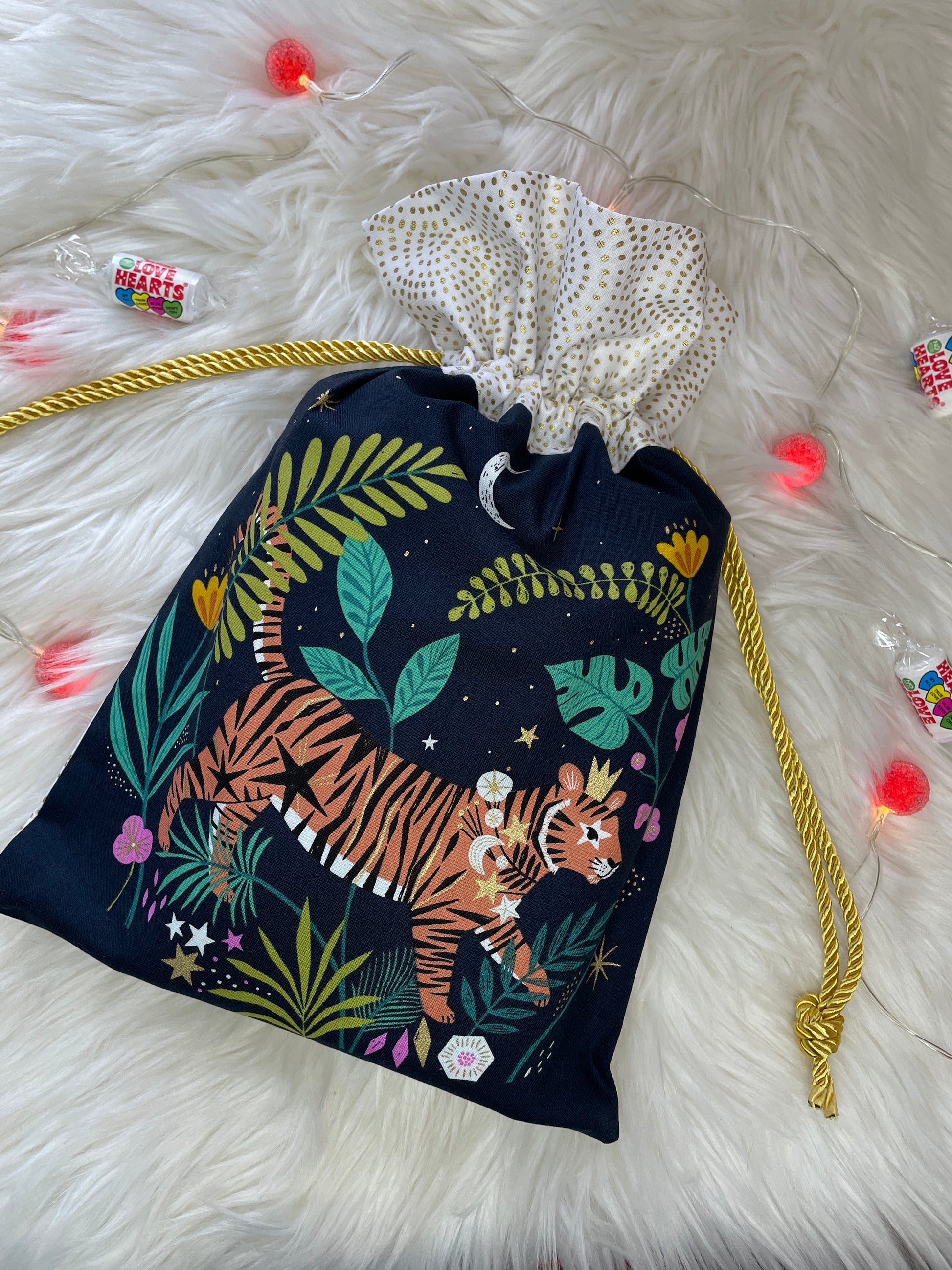 Made from 100% designer cotton fabric, the front features a cute animal surrounded by brightly coloured flowers and leaves, with flashes of metallic gold, on either a dark blue, turquoise or green background. The top drawstring channel and backing fabric is a gorgeous white cotton which has gold metallic swirls on. The bag is closed with a gold braided cord.