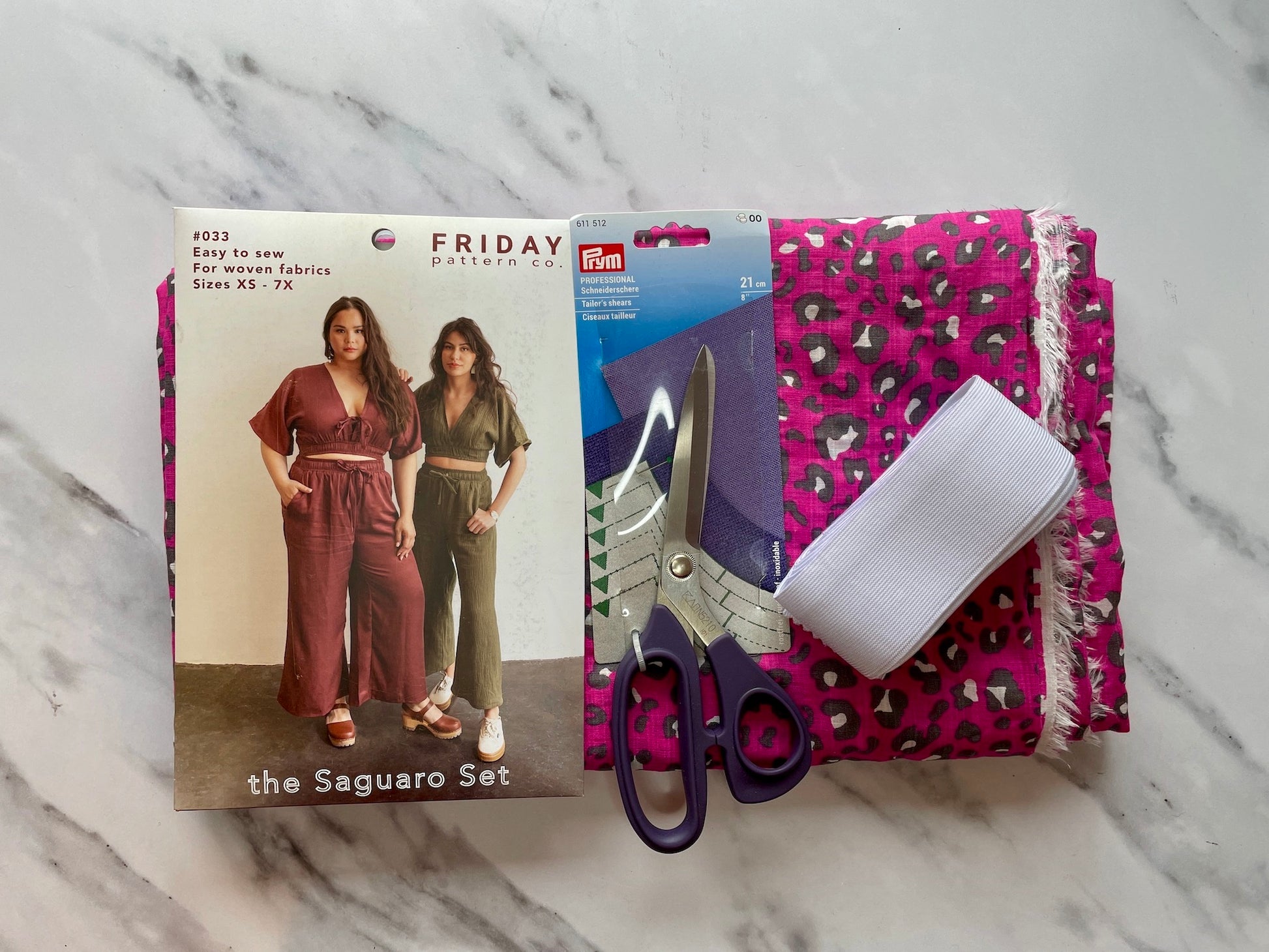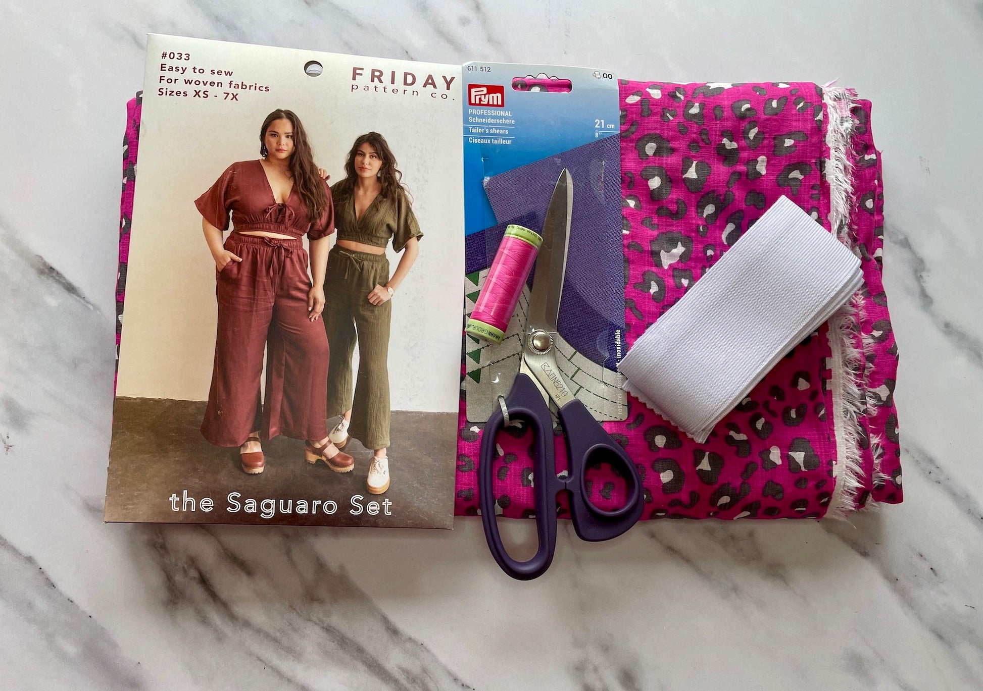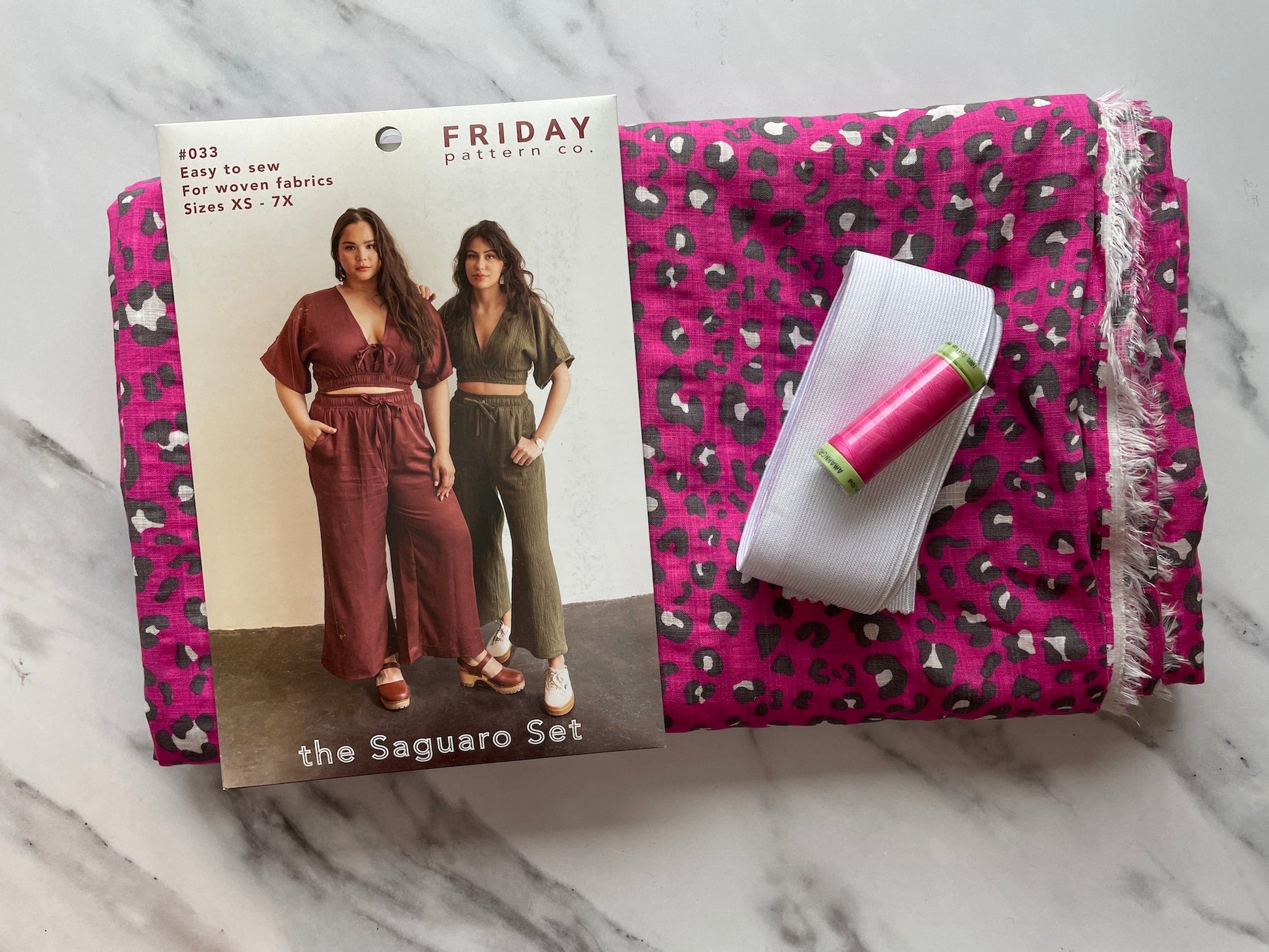 🧵 The saguaro set is a two piece made up of elastic waistband pants and a pullover top. The trousers feature roomy pockets and a waistband with a drawstring, making it very comfortable and the top is cropped and has a plunging V neckline that includes an optional tie closure. You can wear the top backwards or forwards. This flowy set is easy to sew and comes in a range of sizes; XXS - X7L (including plus sizes 1-5). The pattern is designed by Friday Pattern Company who have created sew along videos on you tube, which is really helpful, especially for beginners.