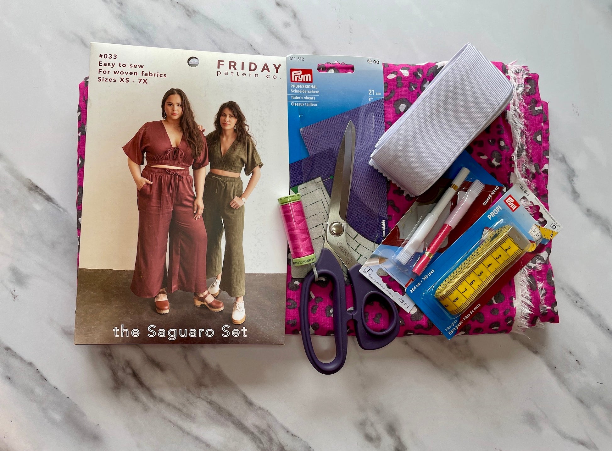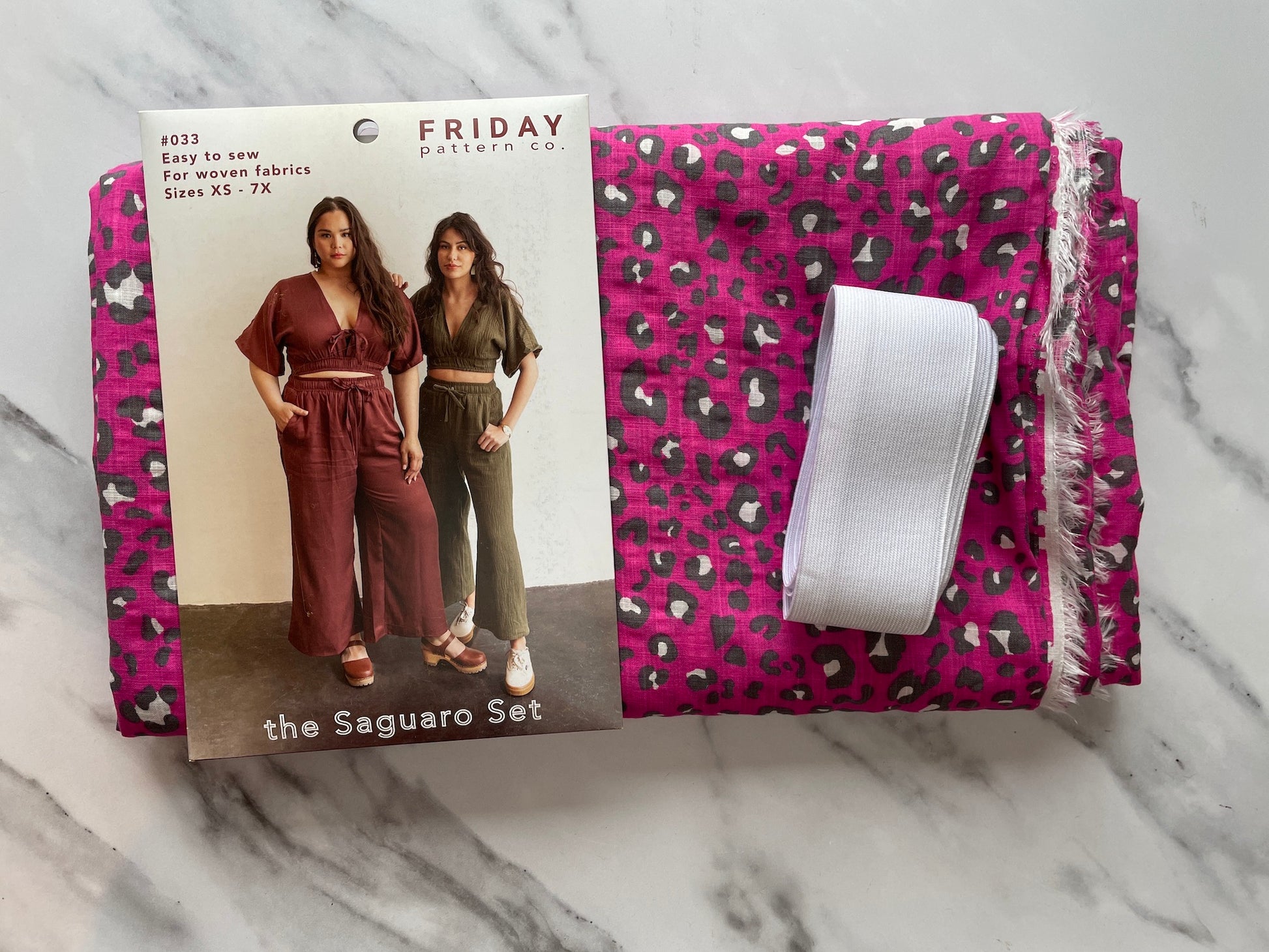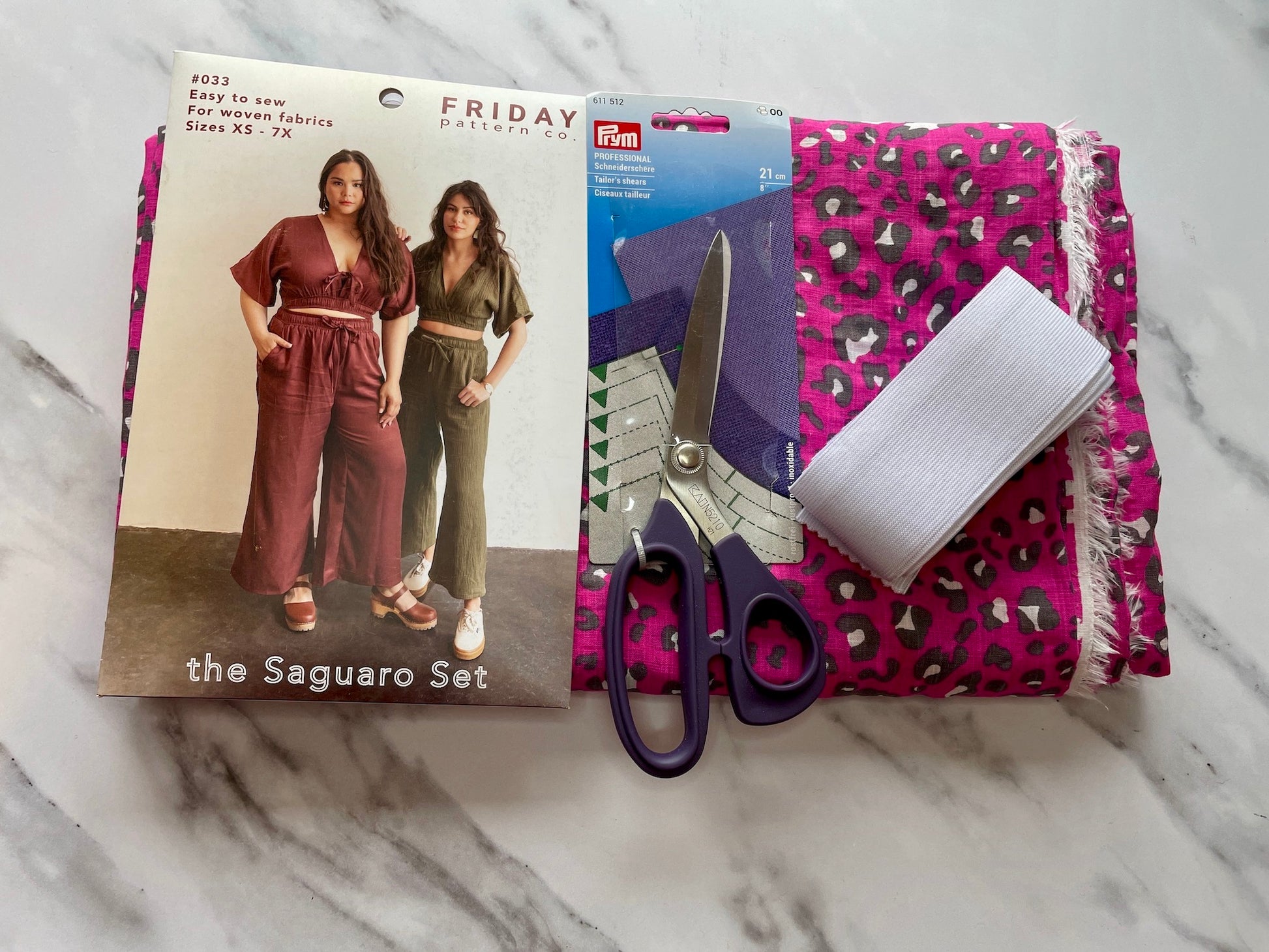 🧵 The saguaro set is a two piece made up of elastic waistband pants and a pullover top. The trousers feature roomy pockets and a waistband with a drawstring, making it very comfortable and the top is cropped and has a plunging V neckline that includes an optional tie closure. You can wear the top backwards or forwards. This flowy set is easy to sew and comes in a range of sizes; XXS - X7L (including plus sizes 1-5). The pattern is designed by Friday Pattern Company who have created sew along videos on you tube, which is really helpful, especially for beginners.