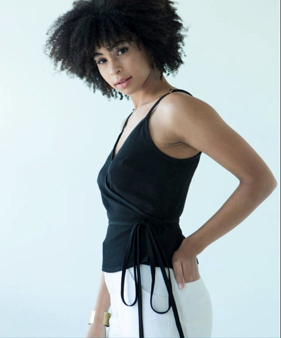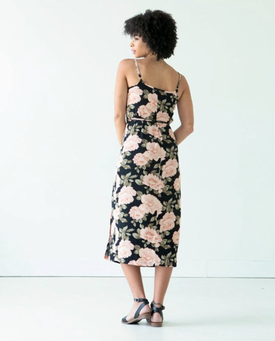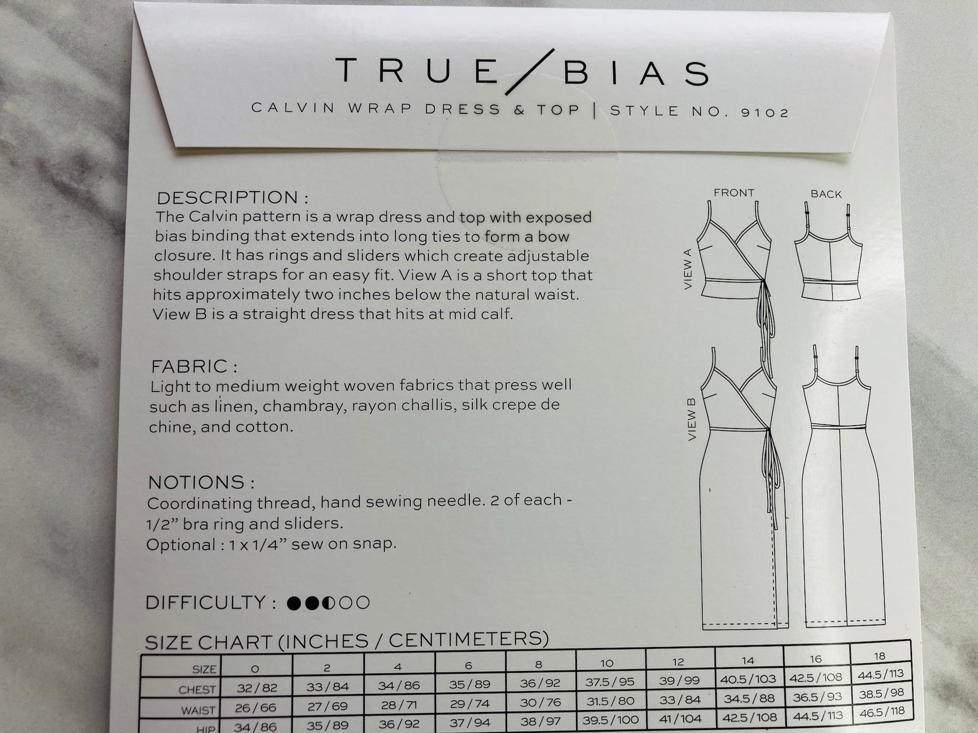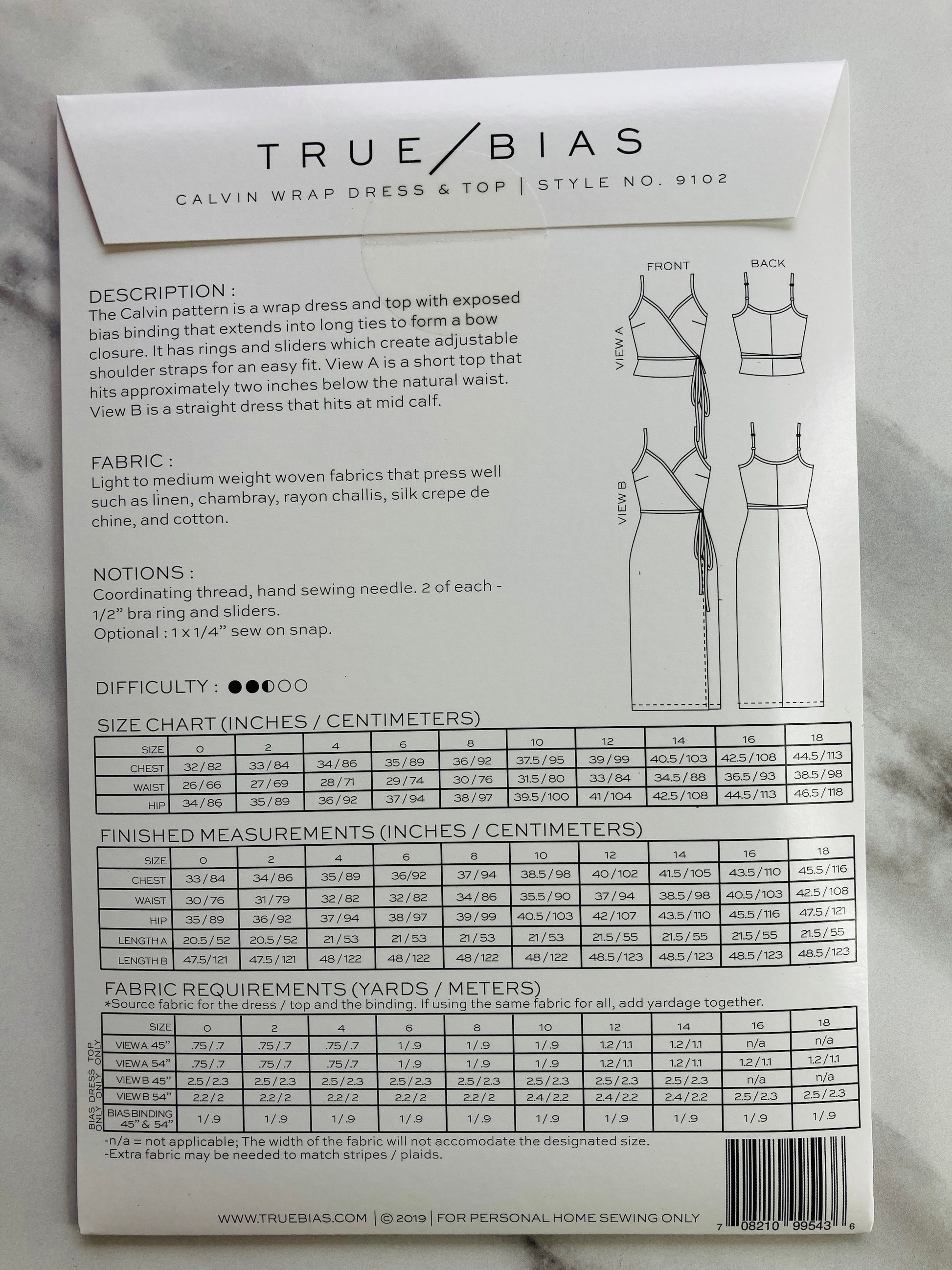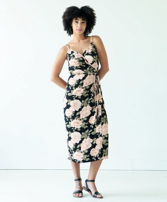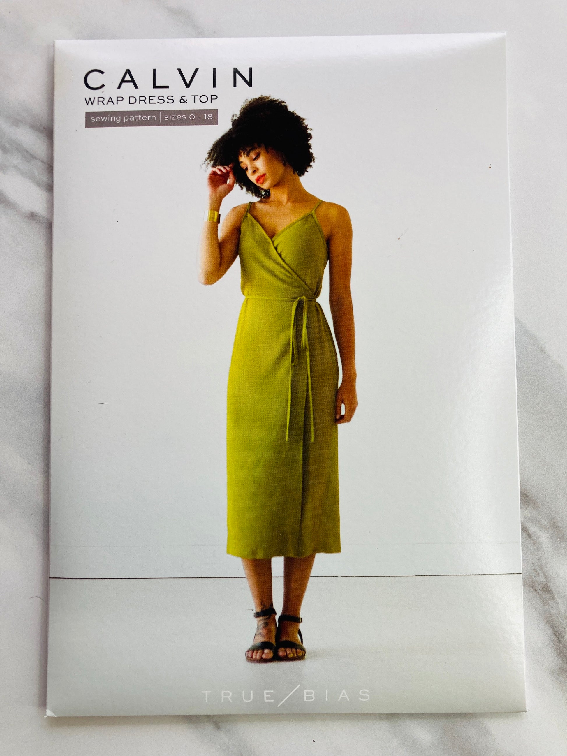 The Calvin pattern is a wrap dress and top with exposed bias binding that extends into long ties to form a bow closure. It has rings and sliders which create adjustable shoulder straps for an easy fit. View A is a short top that hits approximately two inches below the natural waist. View B is a straight dress that hits at mid calf.